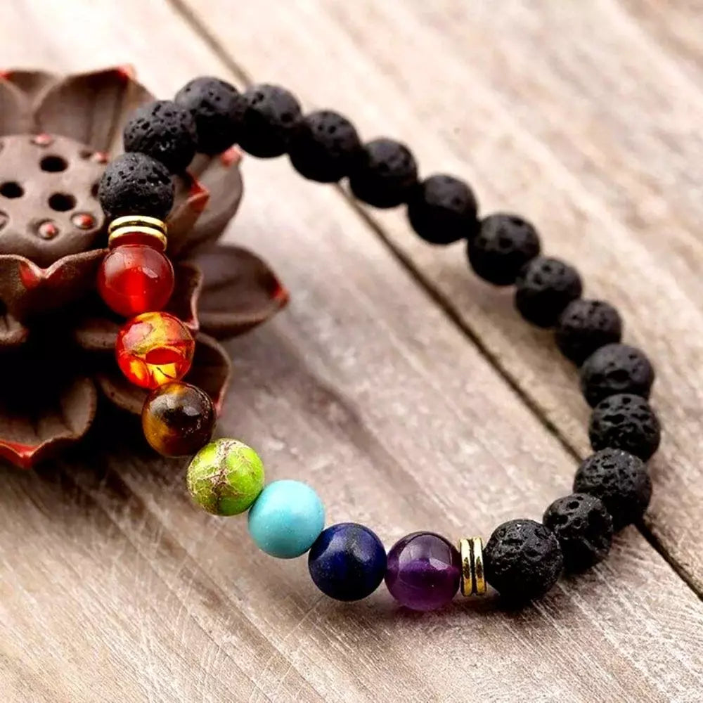 Bransoletka wykonana jest z naturalnej lawy wulkanicznej, znanej z właściwości absorbujących olejki eteryczne. Dzięki temu możesz dodać ulubiony zapach i cieszyć się jego kojącym działaniem przez cały dzień. Siedem kolorowych koralików reprezentuje siedem głównych czakr – każda z nich odpowiada za inne aspekty duchowe i emocjonalne: od miłości i spokoju po kreatywność i siłę wewnętrzną.