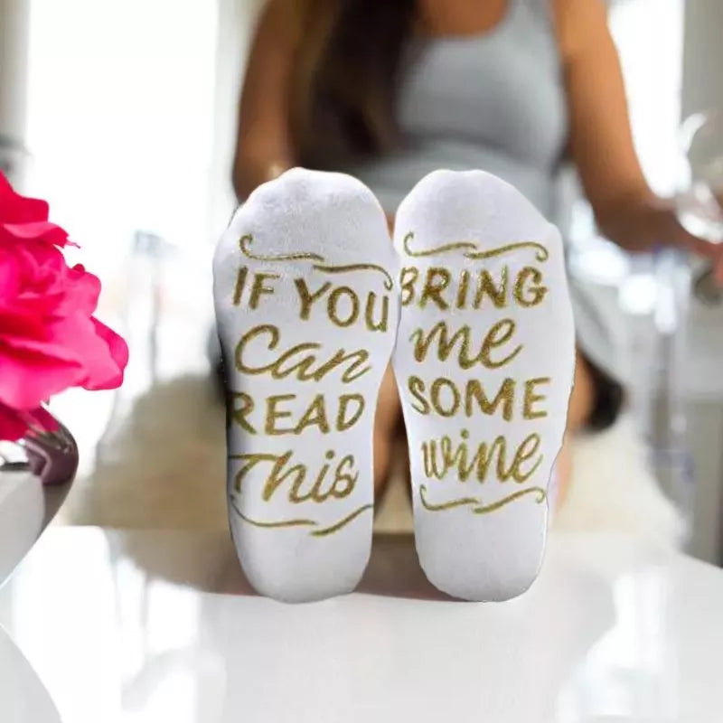 Zabawne skarpetki Bring Me Wine biale z zlotym napisem