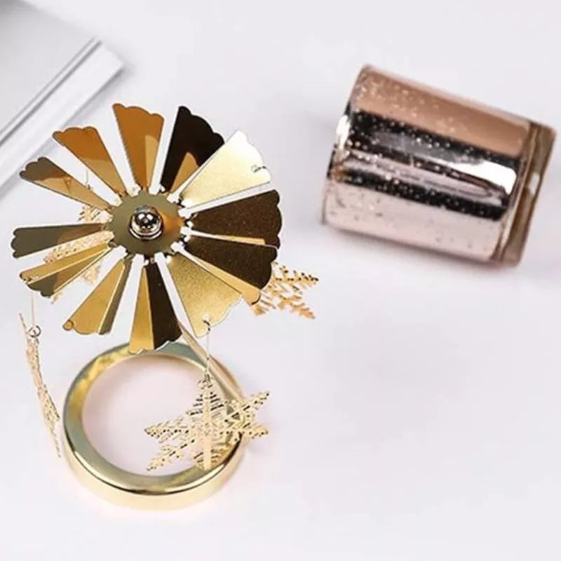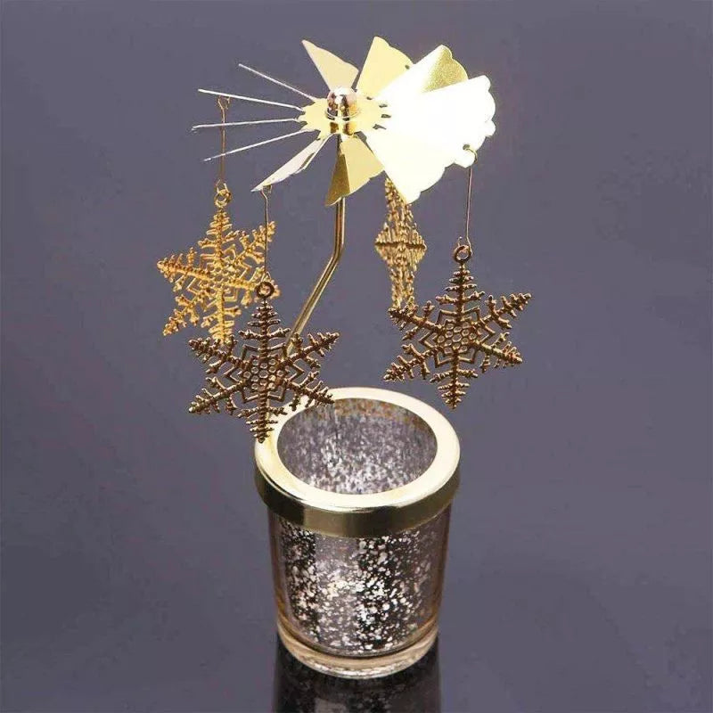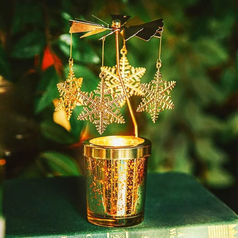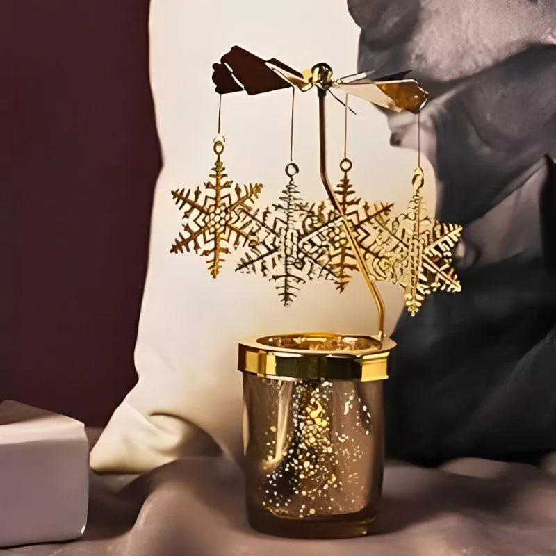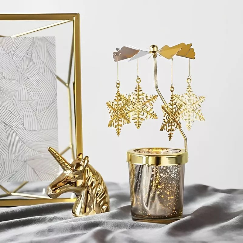 Świąteczny urok i złote detale. Karuzela ze śnieżynkami obraca się delikatnie w świetle płomienia, tworząc niepowtarzalny efekt wizualny. Wykończenia w kolorze złota dodają elegancji, a metalowy stop, z którego został wykonany świecznik, zapewnia trwałość i odporność na wysokie temperatury.