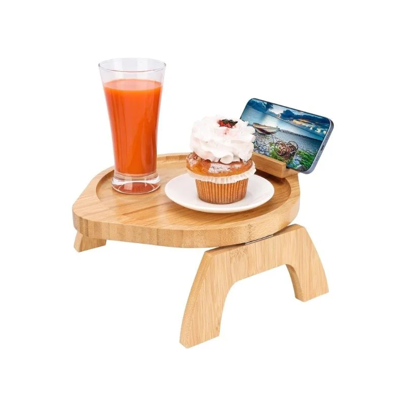 Kto powiedzial, ze nie mozna jesc sniadania na kanapie jak prawdziwy boss? Z ta okragla taca z drewna, specjalnie zaprojektowana na podlokietnik kanapy, mozesz trzymac kawe, ciastka i telefon w jednym miejscu – bez rozlania, bez stresu!