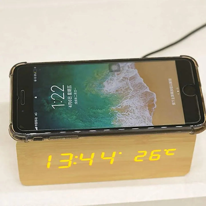 Wiecej niz budzik. Ten zegar LED laczy minimalistyczny design z funkcjonalnoscia. Obudowa w stylu drewna dodaje ciepla i nowoczesnego charakteru kazdemu wnetrzu.