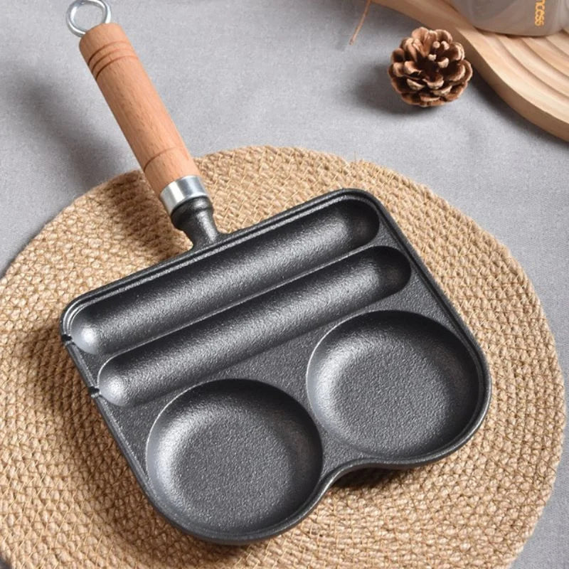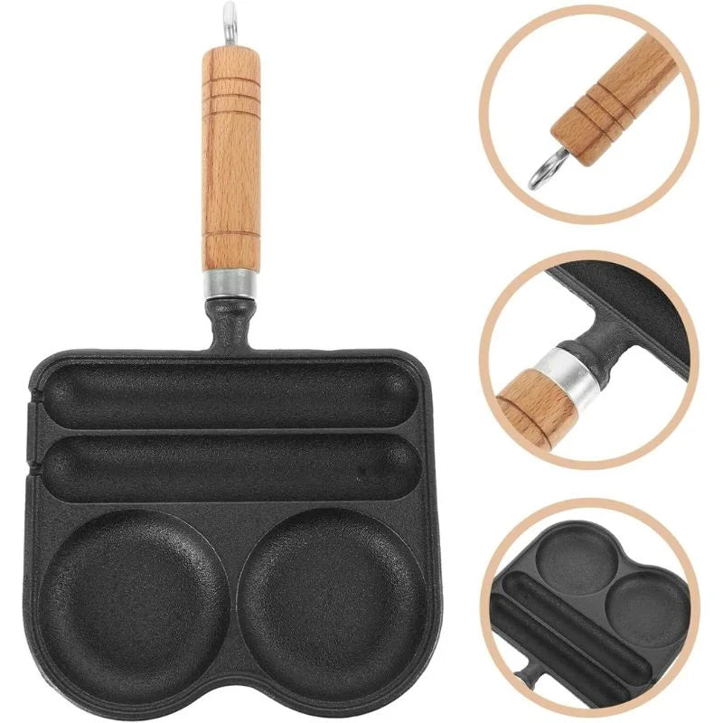 Odmień swoją poranną rutynę dzięki tej wielofunkcyjnej patelni. Wykonana z wytrzymałego żeliwa, Patelnia Perfect Breakfast została specjalnie zaprojektowana do jednoczesnego smażenia kiełbasek i jajek – posiada dwa okrągłe miejsca na jajka oraz przestrzeń dedykowaną kiełbaskom. Drewniany ergonomiczny uchwyt zapewnia bezpieczną i wygodną obsługę. Zestaw zawiera również praktyczne akcesoria: łopatkę, pędzelek do oleju i bambusowe patyczki, które ułatwiają i uprzyjemniają gotowanie.