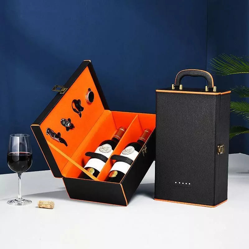 Czy słyszałeś kiedyś o magicznym pudełku, które chroni dwóch niezawodnych towarzyszy każdej uroczystości? Poznaj Deluxe Box na 2 butelki wina z akcesoriami, którego pomarańczowe wnętrze rozświetla serce niczym poranny wschód słońca. Jeśli wino miałoby swojego superbohatera – bez wątpienia byłoby to właśnie to pudełko. Eleganckie, solidne, z duszą – gotowe, by opowiadać historię smaku i wspólnych chwil.